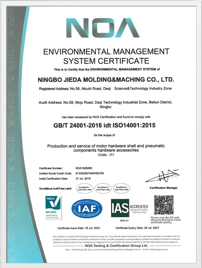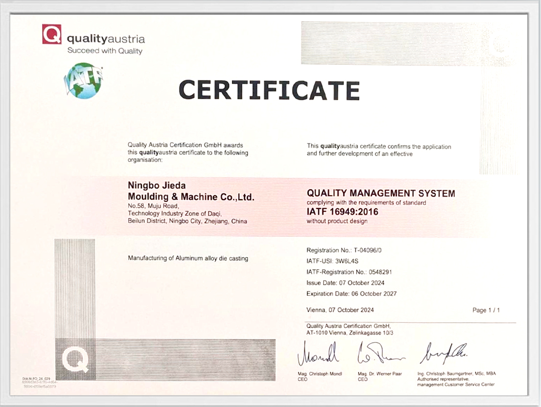 Ningbo Jieda Molding & Machine Co., Ltd.는 알루미늄 다이 캐스팅 금형 및 정밀 다이 캐스팅 부품의 전문 설계 및 제조를 통합하는 전국 첨단 기업입니다. 이 회사는 설립 이후“사실과 전문 서비스로부터 진실을 찾는 것”이라는 비즈니스 철학을 항상 준수했으며 기술 혁신과 품질 개선을 통해 고객의 개인화 된 요구 사항을 충족시키기 위해 노력하고 있습니다. Jieda는 국제 자동차 산업 품질 관리 시스템 IATF16949의 인증을 통과했을뿐만 아니라 위험 예방, 명확한 목표, 명확한 프로세스, 객관적인 데이터 및 지속적인 개선을 강조하여 생산 프로세스의 모든 단계가 표준을 충족시킬 수 있도록이 기반으로 일련의 체계적인 폐쇄 루프 관리 모델을 도입했습니다.